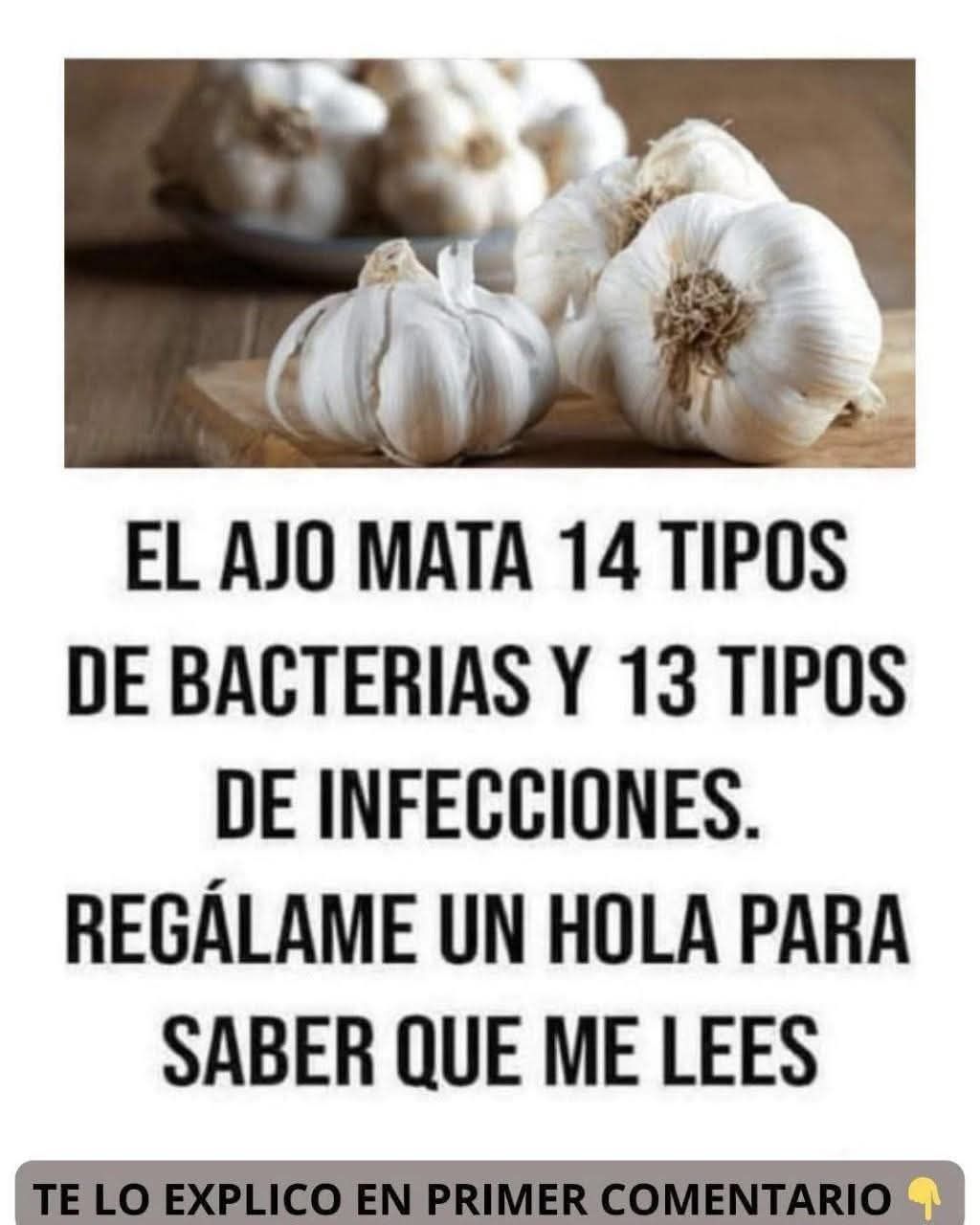 La imagen lo dice todo: el ajo no grita, no promete milagros instantáneos, no se vende en envases caros. Simplemente está ahí. Firme. Real. Y cuando lees esas palabras —“el ajo mata tipos de bacterias y tipos de infecciones”— algo se despierta dentro de ti. Una mezcla de curiosidad, esperanza y asombro.